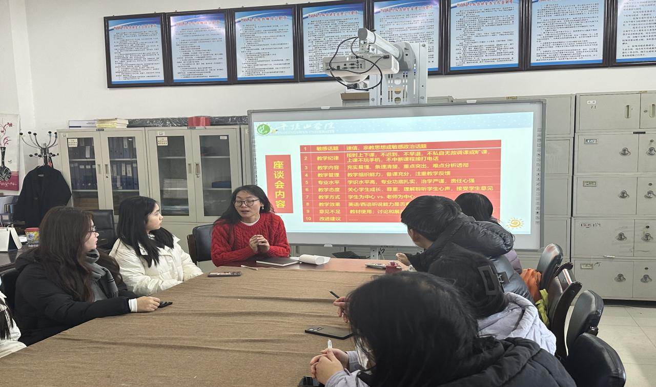 此次座谈会的目的主要跟踪和了解学期初学生对于两位外教提出的相关建议和意见的改善和落实情况。经轮流发言,各个学生代表对于这学期外教Angel老师和Maria老师的教育教学工作给予了充分的肯定,特别是对于本学期外教针对学生在教学内容设计、教学语速、课堂组织管理、课后辅导答疑等方面提出的建议做出的相应调整给予感谢。外教合作教师王新老师也结合外教情况对学生的反馈进行了及时回应与互动交流。在认真聆听学生代表逐一发言后,郭晓燕老师表示,中外合作教研室会继续为外教和学生的沟通交流搭建平台,欢迎学生对beplay官方体育教育教学、课程设置、管理服务等方面提出合理化意见。