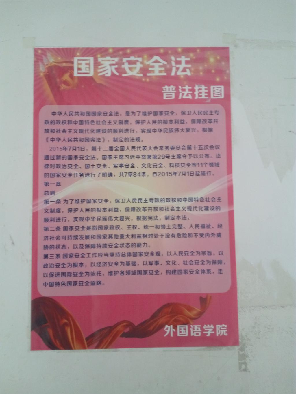 2018年4月15日,迎来了中华民族共和国的第三个全民国家安全教育日。我院为了加深当代大学生对《中华人民共和国反间谍法》和《中华人民共和国国家安全法》的了解,增强当代大学生的国家安全意识,于4月26日晚上七点在图书馆615举办了全民国家安全教育主题班会。