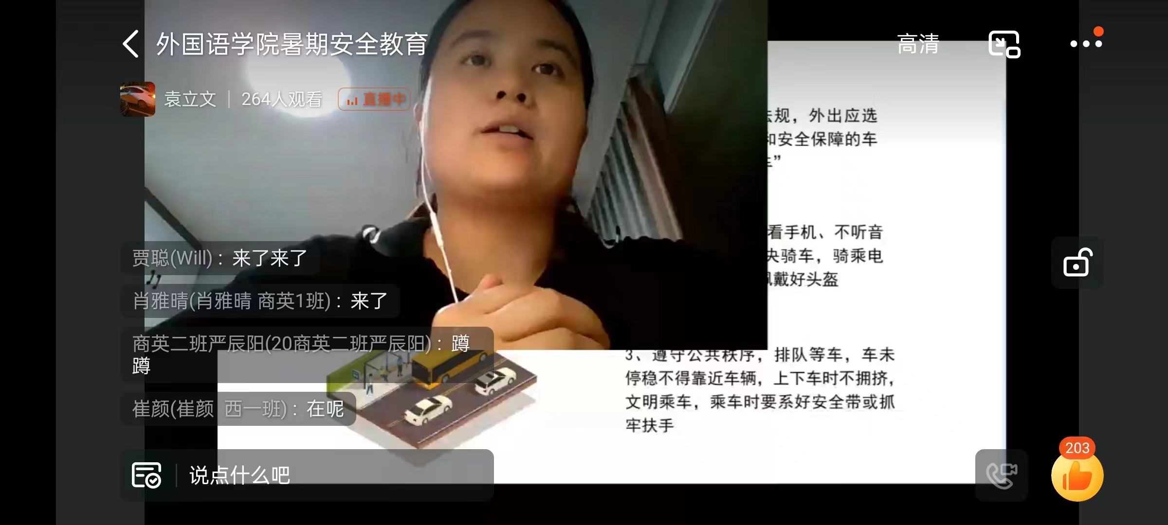 班会伊始,袁立文从交通安全讲起,她提到,暑假期间,大学生探亲访友、进行长途旅行等外出活动大幅增多。当前交通环境日益复杂、行人走路看手机、随意横穿马路等行为带来的悲剧仍不时发生,因此,她呼吁同学们要遵守交通法规、文明出行。接着,她针对近期频发的暴雨、高温等气候现象,嘱咐同学们要注意极端天气,面对高温,不要随意外出游泳,珍爱生命,谨防溺水,面对暴雨等其他极端天气情况,多掌握一些自救知识,以便在遇到灾害时最大程度地保证人身安全。随后,她再次强调疫情防控的重要性,并叮嘱同学们跨省出游一定要提前报备,同时做好防护措施,时刻保持警惕,保证人身安全。最后,她希望同学们能时刻将“安全无小事,生命重泰山”这一原则牢记心间,无论在哪里都要重视安全问题。同时,她建议同学们在家中能够多和家长沟通交流,在力所能及的情况下多帮父母做一些家务,合理分配自己的时间,做好暑期规划。